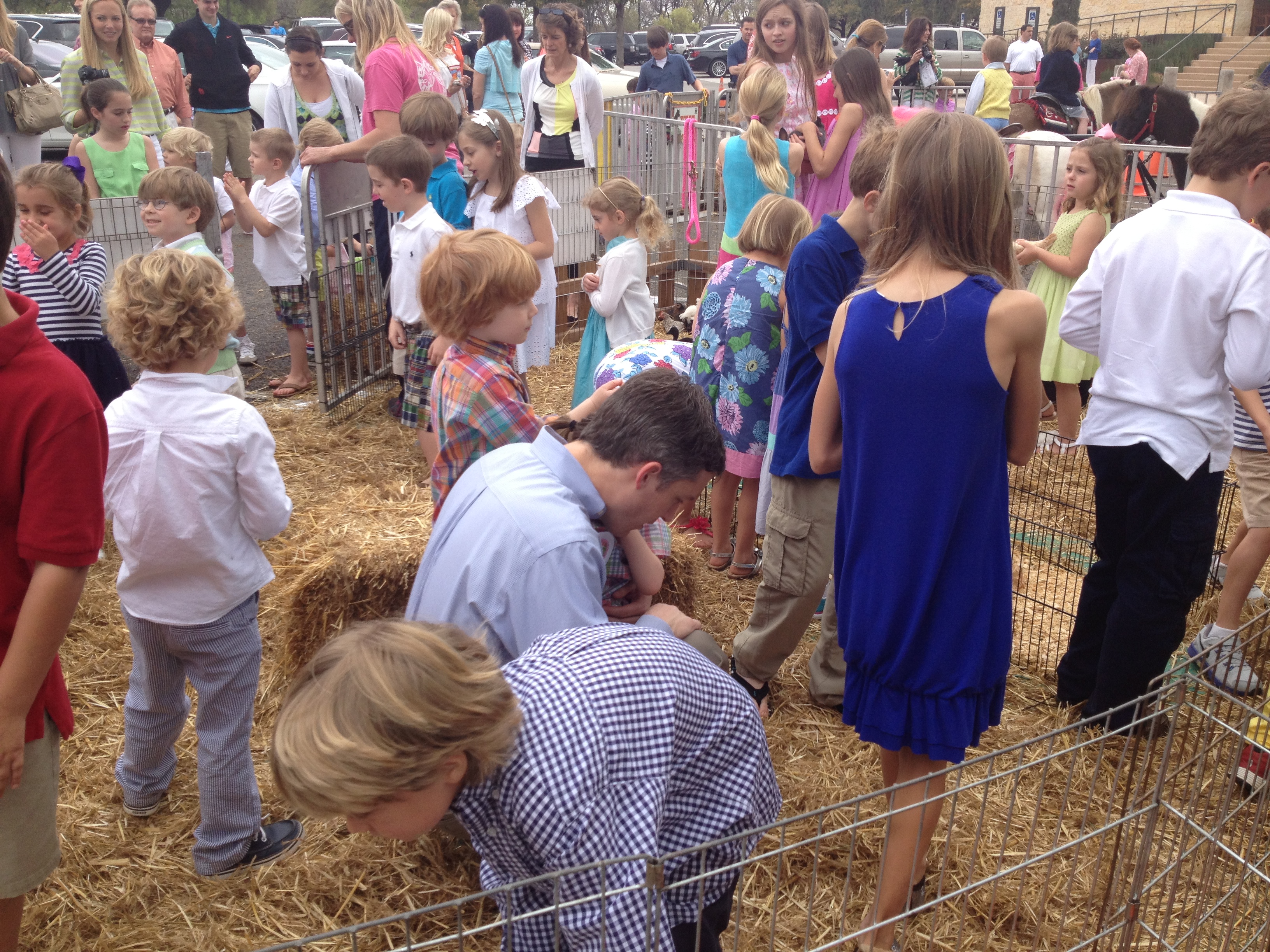 Before the hunt we visit the petting zoo. One day, I am going to get thrown out because I am going to dress down every parent whose child is lifting baby ducks by the head, nearly stomping on terrorized bunnies and playing tug of war over a lamb. I stand beside the fenced area where I gasp and cover my eyes waiting for something to keel over dead. Possibly me. Parents gather outside the fence taking pictures and chatting as they ignore little Brenda holding onto bunnies back legs as he attempts an escape. Those feet were definitely not lucky for him. “Play dead! Play dead!” I shout above the chaos.