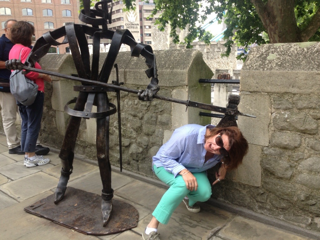 Sandy and I were tired enough last night to go to sleep in a room that was approximately 80 degrees last night. Not exaggerating. Dave and Amy were expected by 9:30 AM to join us on a trip to The Tower. They were also responsible for deciding what sort of Tube tickets we needed for the week. After purchasing a 6 day Oyster card we made our way to The Tower, where much to our admiration of Rick Steves there was not a line to enter. Apparently being first or last to enter is the primo goal. Amy was in charge of the map, and our first destination was the Tower Jewels. Unfortunately, no cameras were allowed, so I have no photos of the crowns,p acceptors, swords and orbs that had us bouncing up and down on or toes and Dave requesting that Amy not hold up her engagement ring/ wedding and to make a comparison. This was sage advice as some of the stones were 150 carats. What we wanted to know sort was how much some of these items weighed. We finally came across a plaque that told us one of the crowns weighed 5 lbs.